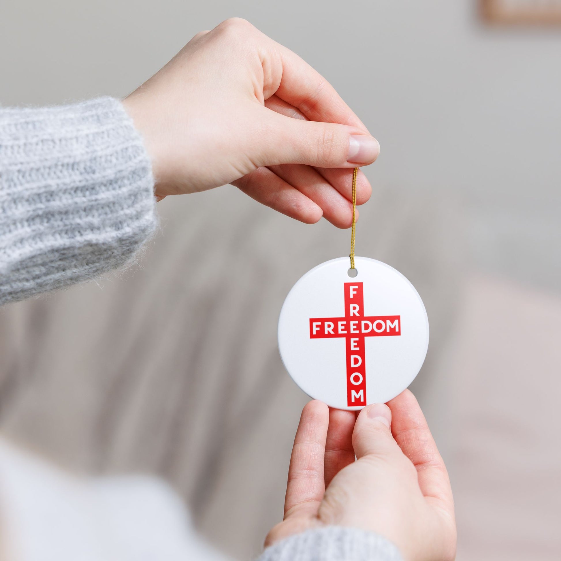 Freedom Cross Ornament is a beautiful ceramic decoration with a glossy finish and matte print, perfect for adding a touch of elegance to any holiday decor. It includes a gold color string for easy hanging and features a UV decoration method for lasting quality. Ideal for those who appreciate religious symbolism and want to celebrate their faith during Christmas or Easter.